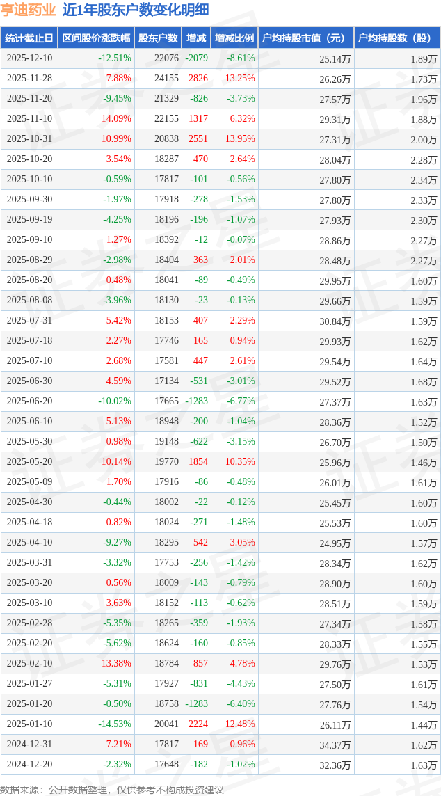 从股价来看,2025年11月28日至2025年12月10日,亨迪药业区间跌幅为12.51%,在此期间股东户数减少2079.0户,减幅为8.61%。