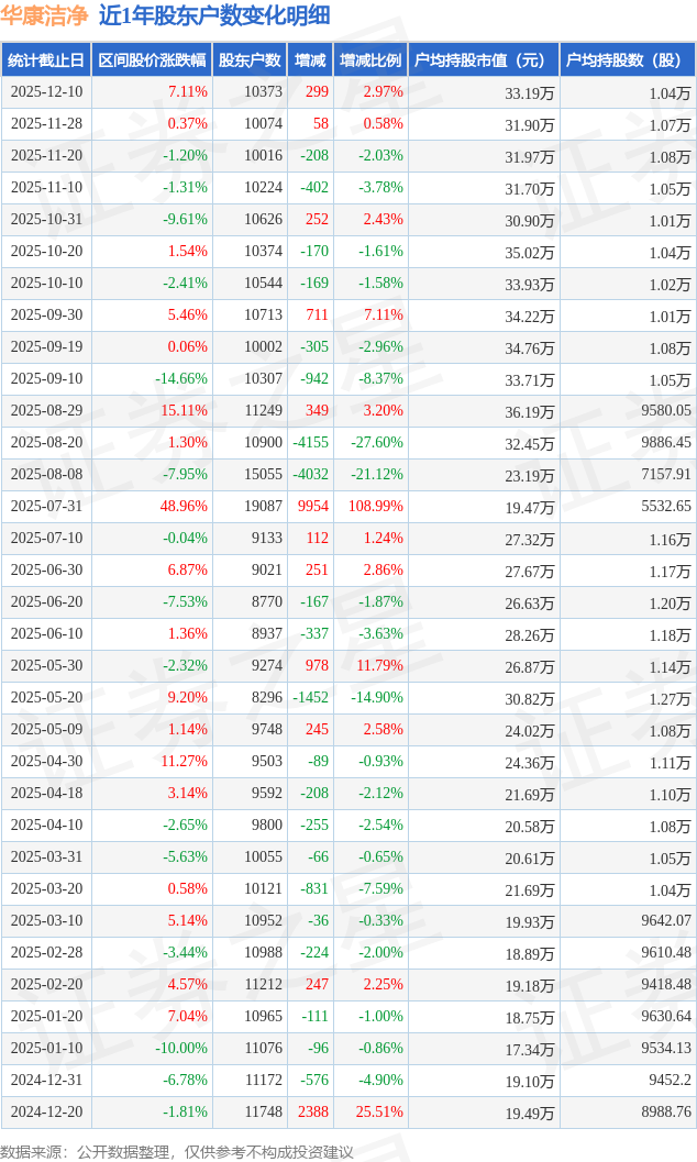 从股价来看,2025年11月28日至2025年12月10日,华康洁净区间涨幅为7.11%,在此期间股东户数增加299.0户,增幅为2.97%。
