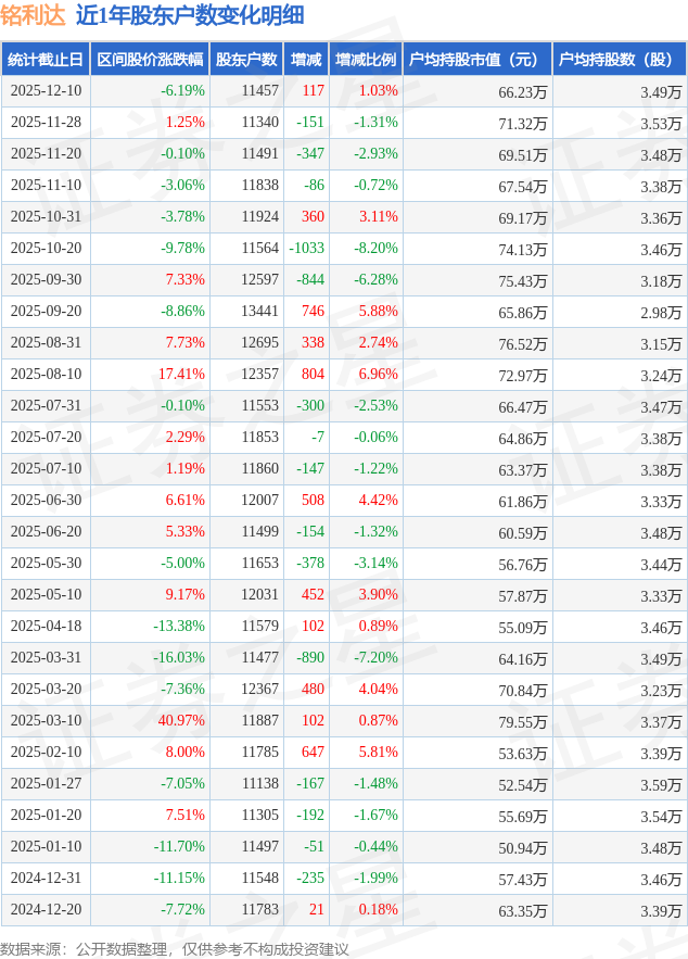 从股价来看,2025年11月28日至2025年12月10日,铭利达区间跌幅为6.19%,在此期间股东户数增加117.0户,增幅为1.03%。