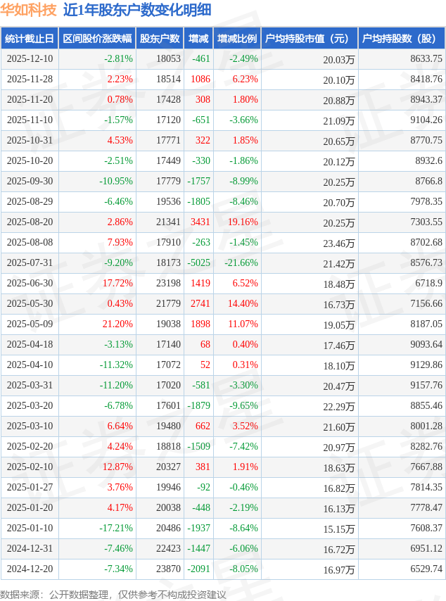 从股价来看,2025年11月28日至2025年12月10日,华如科技区间跌幅为2.81%,在此期间股东户数减少461.0户,减幅为2.49%。