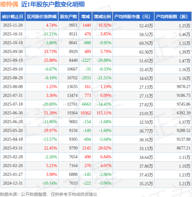 从股价来看,2025年10月31日至2025年11月20日,唯特偶区间涨幅为4.74%,在此期间股东户数增加1440.0户,增幅为16.92%。