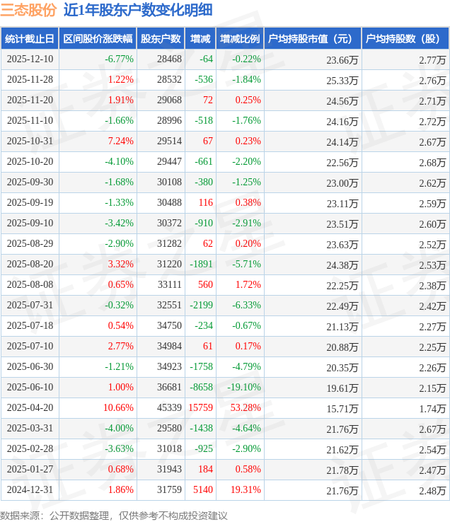 从股价来看,2025年11月28日至2025年12月10日,三态股份区间跌幅为6.77%,在此期间股东户数减少64.0户,减幅为0.22%。