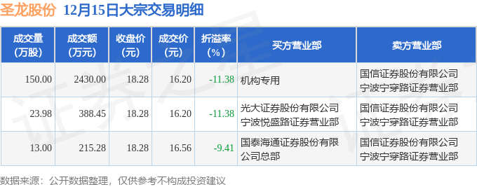 证券之星消息,12月15日圣龙股份发生大宗交易,交易数据如下: