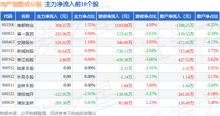 资金流向方面,地产指数(000006)成份股当日主力资金净流出合计4.73亿元,游资资金净流入合计9977.57万元,散户资金净流入合计3.73亿元。成份股资金流向详情见下表: