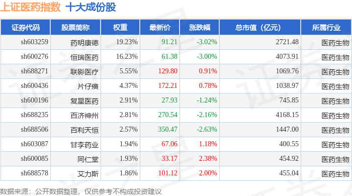 上证医药(000037)指数十大成份股详情如下: