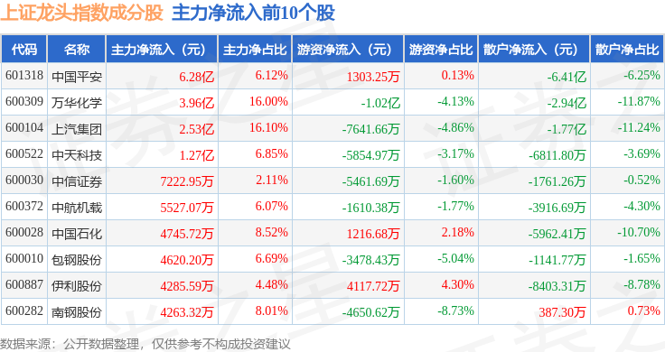 资金流向方面,上证龙头(000065)指数成份股当日主力资金净流出合计75.37亿元,游资资金净流入合计32.72亿元,散户资金净流入合计42.64亿元。成份股资金流向详情见下表: