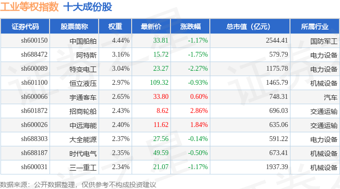 证券之星消息,12月15日,工业等权(000072)指数报收于2975.39点,跌0.21%,成交410.87亿元,换手率0.64%。当日该指数成份股中,上涨的有22家,招商轮船以2.86%的涨幅领涨,下跌的有26家,中国中车以4.37%的跌幅领跌。