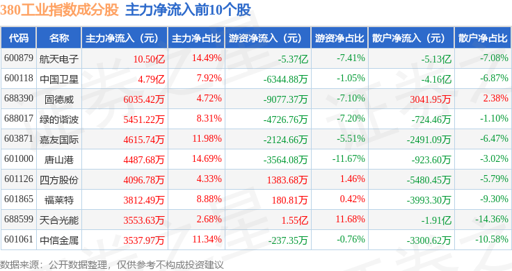 资金流向方面,380工业(000106)指数成份股当日主力资金净流出合计2159.41万元,游资资金净流出合计1.76亿元,散户资金净流入合计1.98亿元。成份股资金流向详情见下表: