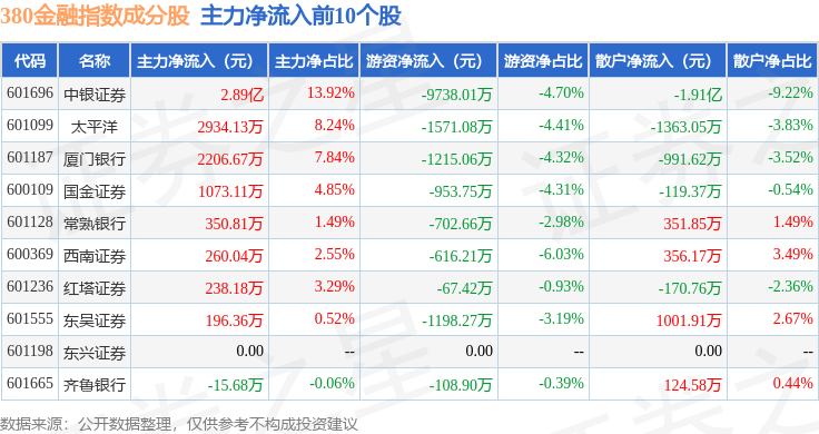 资金流向方面,380金融(000110)指数成份股当日主力资金净流入合计1.58亿元,游资资金净流出合计1.79亿元,散户资金净流入合计2096.33万元。成份股资金流向详情见下表: