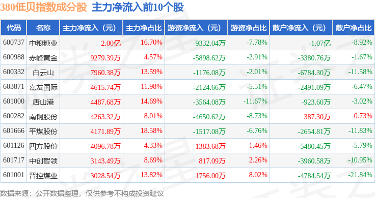 资金流向方面,380低贝(000138)指数成份股当日主力资金净流入合计1.03亿元,游资资金净流出合计1.96亿元,散户资金净流入合计9286.95万元。成份股资金流向详情见下表: