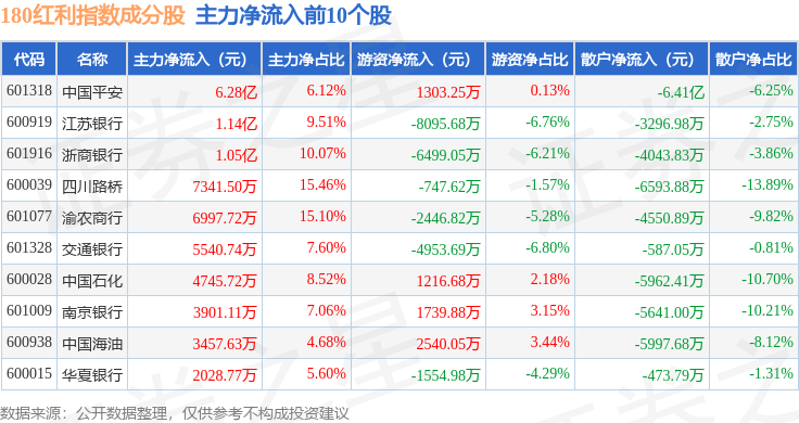 资金流向方面,180红利(000149)指数成份股当日主力资金净流入合计6.54亿元,游资资金净流入合计1.22亿元,散户资金净流出合计7.76亿元。成份股资金流向详情见下表: