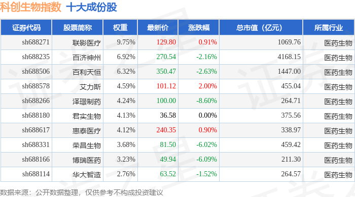 证券之星消息,12月15日,科创生物(000683)指数报收于1096.84点,跌2.01%,成交96.36亿元,换手率1.15%。当日该指数成份股中,上涨的有9家,浩欧博以3.65%的涨幅领涨,下跌的有38家,泽璟制药以8.6%的跌幅领跌。