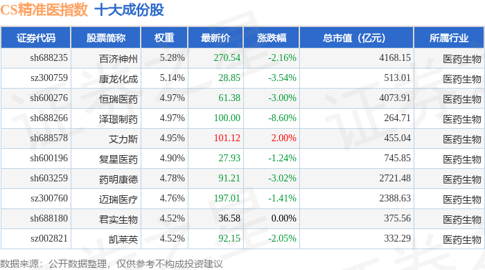 证券之星消息,12月15日,CS精准医(000863)指数报收于2679.92点,跌2.19%,成交152.57亿元,换手率1.17%。当日该指数成份股中,上涨的有6家,昭衍新药以3.35%的涨幅领涨,下跌的有32家,泽璟制药以8.6%的跌幅领跌。