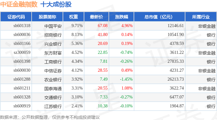 证券之星消息,12月15日,中证金融(000934)指数报收于6196.6点,涨0.67%,成交746.64亿元,换手率0.38%。当日该指数成份股中,上涨的有53家,中国平安以4.96%的涨幅领涨,下跌的有41家,华林证券以3.33%的跌幅领跌。