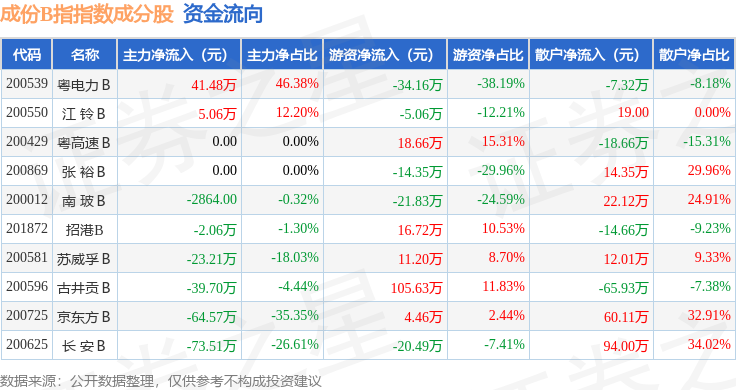 资金流向方面,成份B指(399003)指数成份股当日主力资金净流出合计156.81万元,游资资金净流入合计60.78万元,散户资金净流入合计96.03万元。成份股资金流向详情见下表: