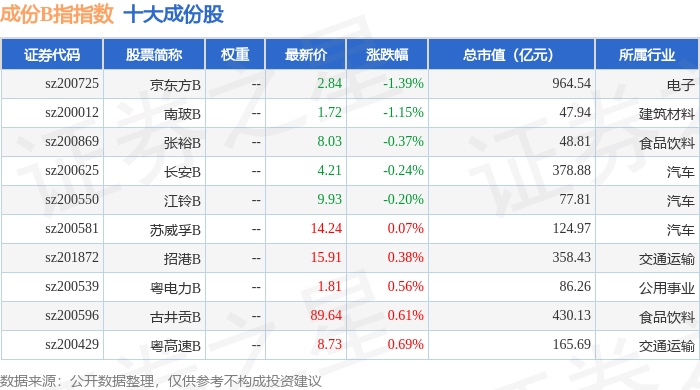 成份B指(399003)指数十大成份股详情如下: