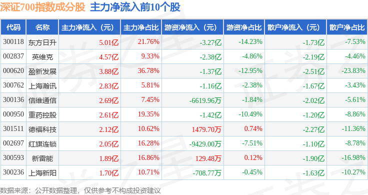 资金流向方面,深证700(399010)指数成份股当日主力资金净流出合计85.78亿元,游资资金净流入合计1.91亿元,散户资金净流入合计83.87亿元。成份股资金流向详情见下表: