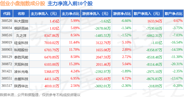 资金流向方面,创业小盘(399020)指数成份股当日主力资金净流出合计25.65亿元,游资资金净流入合计1.83亿元,散户资金净流入合计23.82亿元。成份股资金流向详情见下表:
