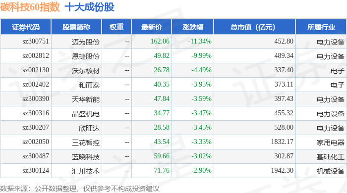 碳科技60(399060)指数十大成份股详情如下: