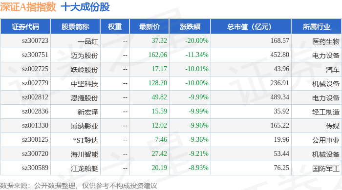 证券之星消息,12月15日,深证A指(399107)指数报收于2567.96点,跌0.77%,成交10088.05亿元,换手率2.62%。当日该指数成份股中,上涨的有1201家,东方日升以20.02%的涨幅领涨,下跌的有1591家,一品红以20.0%的跌幅领跌。