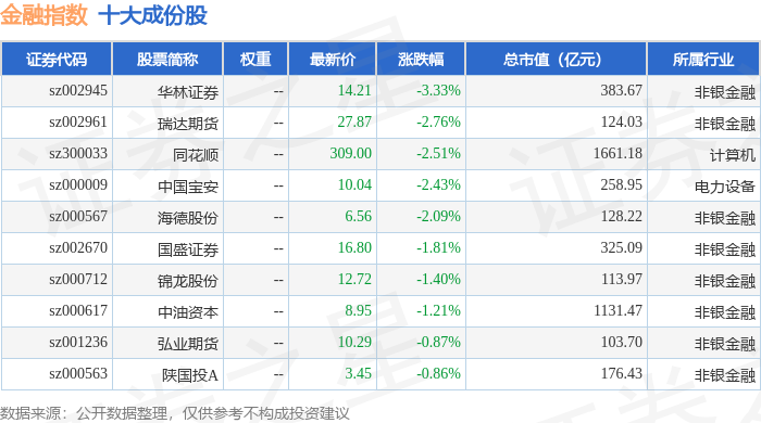 证券之星消息,12月15日,金融指数(399240)报收于1565.54点,跌0.09%,成交185.87亿元,换手率0.7%。当日该指数成份股中,上涨的有14家,宁波银行以1.91%的涨幅领涨,下跌的有18家,华林证券以3.33%的跌幅领跌。