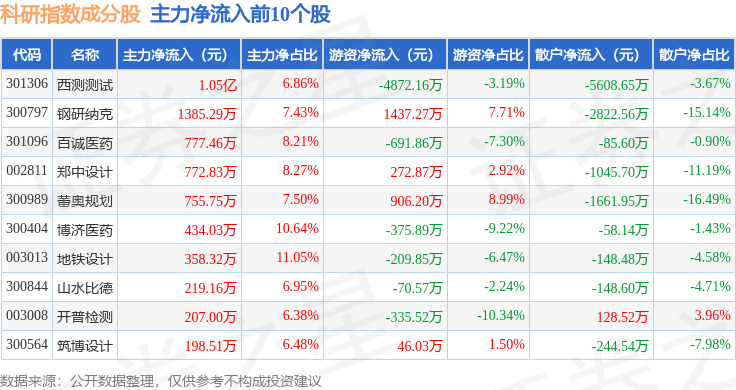 资金流向方面,科研指数(399243)成份股当日主力资金净流出合计1.41亿元,游资资金净流出合计9617.31万元,散户资金净流入合计2.37亿元。成份股资金流向详情见下表: