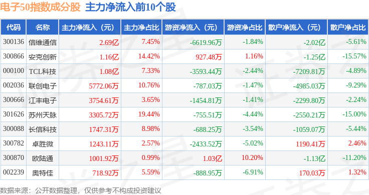 资金流向方面,电子50(399281)指数成份股当日主力资金净流出合计52.13亿元,游资资金净流入合计16.28亿元,散户资金净流入合计35.85亿元。成份股资金流向详情见下表: