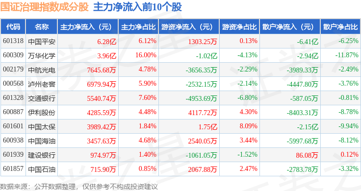 资金流向方面,国证治理(399322)指数成份股当日主力资金净流出合计70.09亿元,游资资金净流入合计29.08亿元,散户资金净流入合计41.02亿元。成份股资金流向详情见下表: