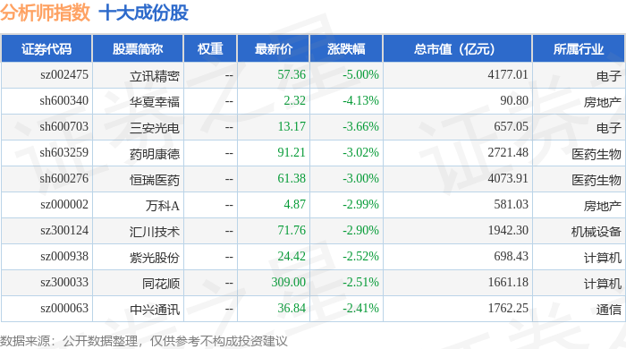 分析师指数(399354)十大成份股详情如下: