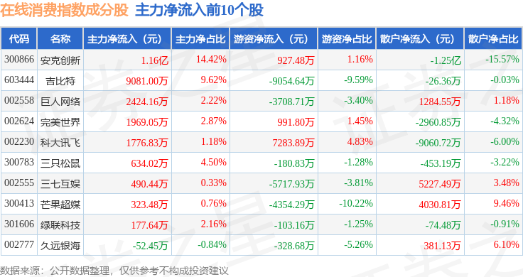 资金流向方面,在线消费(399361)指数成份股当日主力资金净流出合计18.27亿元,游资资金净流入合计1.1亿元,散户资金净流入合计17.17亿元。成份股资金流向详情见下表:
