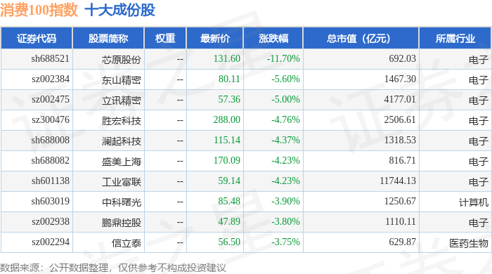 证券之星消息,12月15日,消费100(399364)指数报收于10587.72点,跌1.66%,成交2158.28亿元,换手率1.12%。当日该指数成份股中,上涨的有23家,中航光电以4.09%的涨幅领涨,下跌的有76家,芯原股份以11.7%的跌幅领跌。