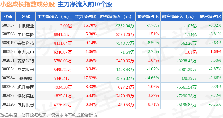 资金流向方面,小盘成长(399376)指数成份股当日主力资金净流出合计40.23亿元,游资资金净流入合计2.91亿元,散户资金净流入合计37.33亿元。成份股资金流向详情见下表:
