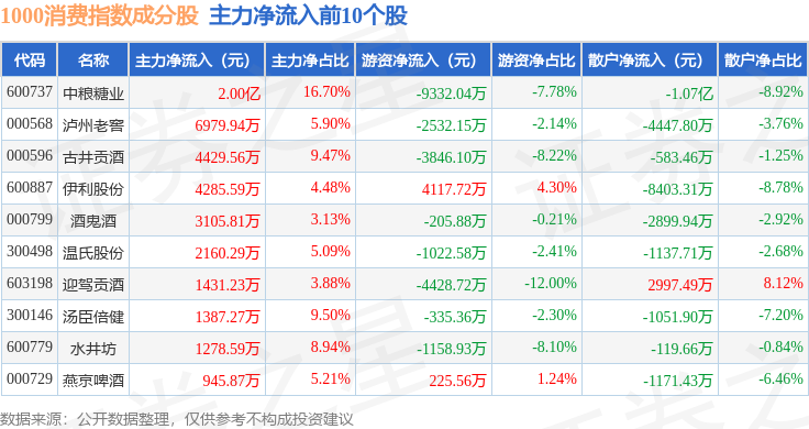 资金流向方面,1000消费(399385)指数成份股当日主力资金净流出合计2.75亿元,游资资金净流入合计1.22亿元,散户资金净流入合计1.53亿元。成份股资金流向详情见下表: