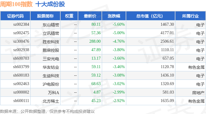 证券之星消息,12月15日,周期100(399402)指数报收于3718.04点,跌0.35%,成交1663.8亿元,换手率0.68%。当日该指数成份股中,上涨的有47家,东方盛虹以5.6%的涨幅领涨,下跌的有49家,东山精密以5.6%的跌幅领跌。