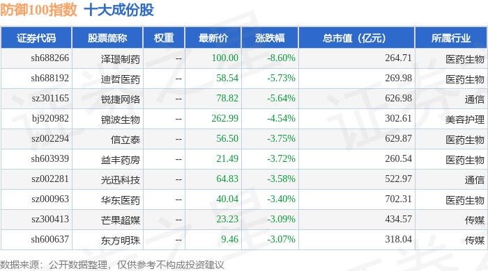 证券之星消息,12月15日,防御100(399403)指数报收于8802.58点,跌0.65%,成交1108.02亿元,换手率1.34%。当日该指数成份股中,上涨的有44家,正邦科技以4.48%的涨幅领涨,下跌的有55家,泽璟制药以8.6%的跌幅领跌。