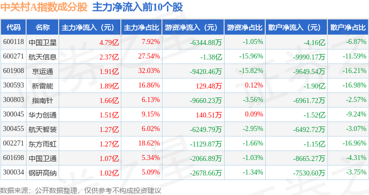 资金流向方面,中关村A(399422)指数成份股当日主力资金净流出合计36.15亿元,游资资金净流入合计3.15亿元,散户资金净流入合计31.36亿元。成份股资金流向详情见下表: