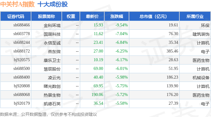 中关村A(399422)指数十大成份股详情如下: