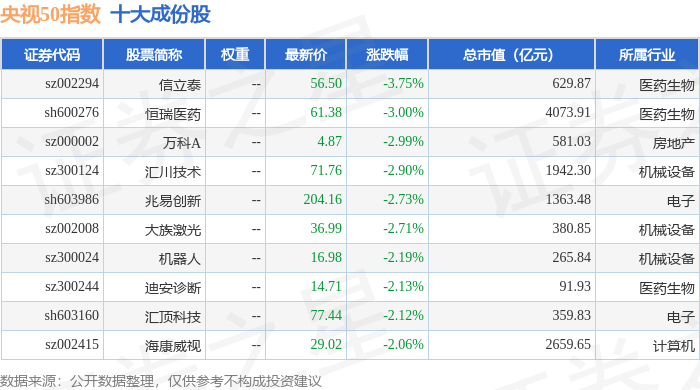 央视50(399550)指数十大成份股详情如下: