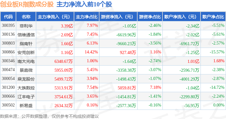 资金流向方面,创业板R(399606)指数成份股当日主力资金净流出合计86.74亿元,游资资金净流入合计17.99亿元,散户资金净流入合计68.75亿元。成份股资金流向详情见下表: