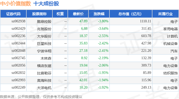 证券之星消息,12月15日,中小价值(399604)指数报收于1971.16点,涨0.03%,成交379.76亿元,换手率0.97%。当日该指数成份股中,上涨的有51家,云南能投以10.0%的涨幅领涨,下跌的有46家,鹏鼎控股以3.8%的跌幅领跌。