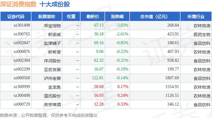 资金流向方面,深证消费(399617)指数成份股当日主力资金净流出合计2991.53万元,游资资金净流出合计231.21万元,散户资金净流入合计3222.74万元。成份股资金流向详情见下表: