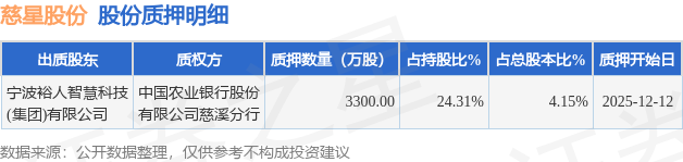 证券之星消息,慈星股份(300307)12月15日公开信息显示,股东宁波裕人智慧科技(集团)有限公司向中国农业银行股份有限公司慈溪分行合计质押3300.0万股,占总股本4.15%。质押详情见下表: