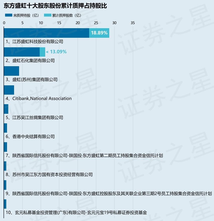 截止本公告日,股东江苏盛虹科技股份有限公司已累计质押股份5.4亿股,占其持股总数的18.89%,股东盛虹石化集团有限公司已累计质押股份1.46亿股,占其持股总数的13.09%。本次质押后东方盛虹十大股东的累计质押股份占持股比例(占持股比例的计算以公司最新一期财务报表公布的十大股东的持股总数为基准)见下图: