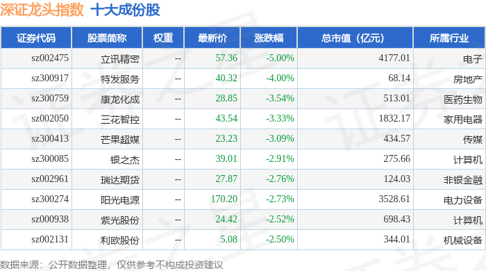 证券之星消息,12月15日,深证龙头(399653)指数报收于2997.78点,跌1.19%,成交840.24亿元,换手率1.15%。当日该指数成份股中,上涨的有18家,红旗连锁以10.07%的涨幅领涨,下跌的有32家,立讯精密以5.0%的跌幅领跌。