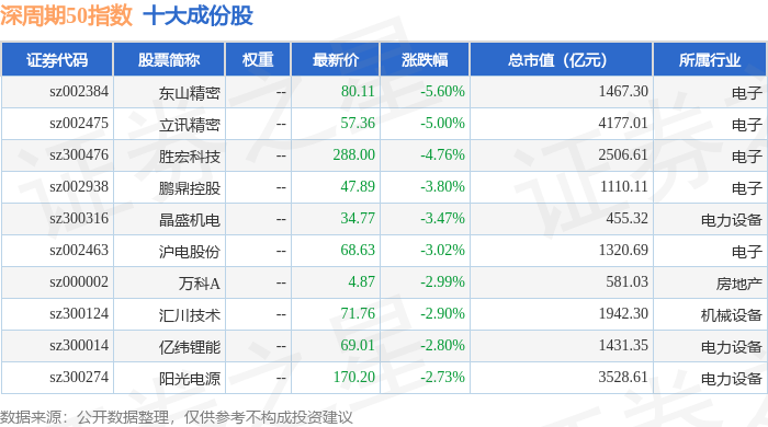 证券之星消息,12月15日,深周期50(399670)指数报收于4190.61点,跌1.6%,成交945.14亿元,换手率1.23%。当日该指数成份股中,上涨的有19家,华峰化学以6.91%的涨幅领涨,下跌的有30家,东山精密以5.6%的跌幅领跌。