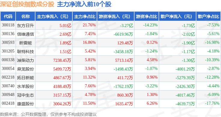 资金流向方面,深证创投(399696)指数成份股当日主力资金净流出合计43.09亿元,游资资金净流入合计10.56亿元,散户资金净流入合计32.53亿元。成份股资金流向详情见下表: