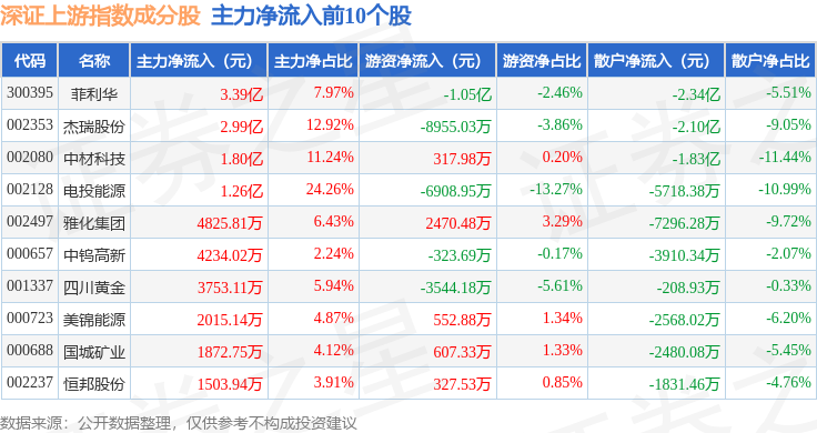 资金流向方面,深证上游(399704)指数成份股当日主力资金净流出合计20.49亿元,游资资金净流入合计3.09亿元,散户资金净流入合计17.4亿元。成份股资金流向详情见下表: