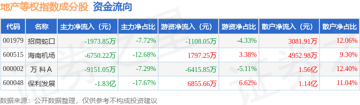 资金流向方面,地产等权(399983)指数成份股当日主力资金净流出合计3.62亿元,游资资金净流入合计1129.0万元,散户资金净流入合计3.5亿元。成份股资金流向详情见下表: