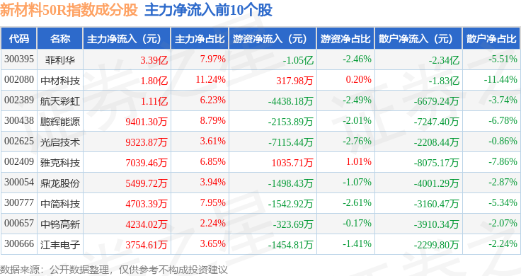 资金流向方面,新材料50R(470042)指数成份股当日主力资金净流出合计24.12亿元,游资资金净流出合计1.31亿元,散户资金净流入合计25.43亿元。成份股资金流向详情见下表: