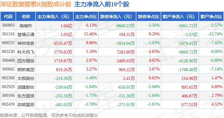 资金流向方面,深证数据要素R(470053)指数成份股当日主力资金净流出合计25.34亿元,游资资金净流入合计3.44亿元,散户资金净流入合计21.89亿元。成份股资金流向详情见下表: